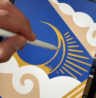 My work is predominantly influenced by nature and celestial objects. I love building up a scene which offers a calming balance through symmetry, often complimented with wavy shapes to lead the eye centrally to either a Sun or Moon. I also love a low horizon line - so there’s a big section of sky allowing the illustration to breathe. Once I have these basic elements, I draw other elements around this. At the moment I’m very inspired by the form of clouds, checkerboard patterns and Mediterranean architecture, especially columns - so as soon as I saw the initial archway shape of the 12 Day Advent Calendar I instantly knew I wanted the archway shape to be a key feature of the scene. My vision from the beginning was for the calendar to be a window looking out at the night sky scene.